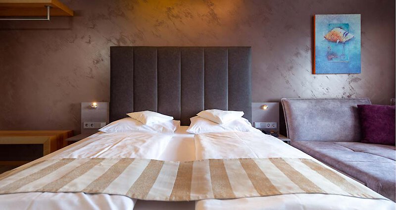 Kuschel-Doppelzimmer – die großen Doppelzimmer mit allem was man für einen Urlaub braucht. Die Kuschel-Doppelzimmer liegen im 1. Stock zur Panorama-Südseite mit unserem einmaligen Ausblick. Die Balkone sind geräumig und mit gemütlichen Möbeln ausgestattet. Alle Balkone haben auch eine Beleuchtung für gemütliche Abende. Die Kuschel-Doppelzimmer haben eine große Relax-Couch zum Entspannen und auch zum Fernsehen. Die Boxspringbetten mit hochwertigem Schlafsystem sind 180x200 cm groß. Eine Sitzgelegenheit und ein Schreib-/Schminktisch gehören zum Mobiliar. Eine große Dusche mit mindestens 100 x 120 cm, WC, Fön und hochwertiges Shampoo in Spendern gehören zur Badezimmerausstattung. Ein geräumiger Safe, eine Minibar mit kleiner Getränkeauswahl vom Mineralwasser bis Prosecco und Chips gehören ebenso zur Ausstattung. Giga-Bit-WLAN, Smart-TV mit Sky und Telefon sind ebenso vorhanden.